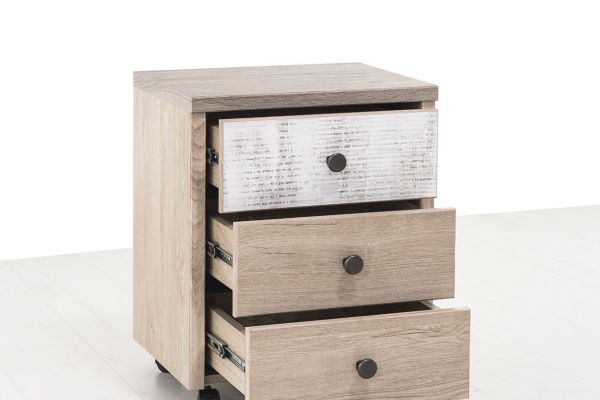 Функциональный и мобильный комод прекрасно справится с ролью прикроватной тумбы, в детской его можно использовать как мини-комод, а в кабинете - в качестве приставного элемента письменного стола. Комод состоит из трех выдвижных ящиков на роликовых направляющих.