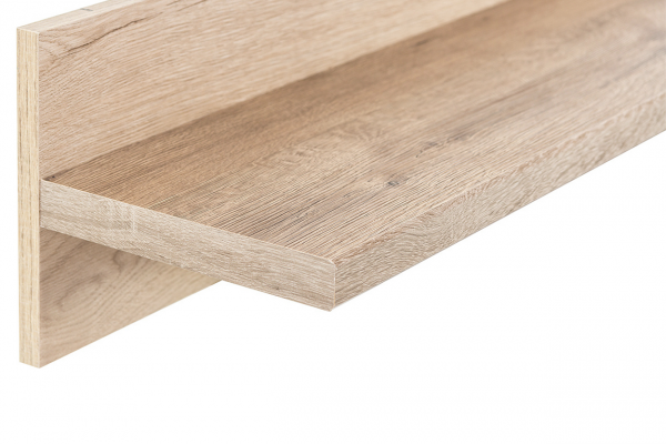 Открытая навесная полка отлично впишется в интерьер детской или подростковой комнаты. Т-образное изделие не имеет декоративных элементов, но сочетание цветов Дуб Мадура и Дуб Веллингтон придает ей эстетическую привлекательность. Полка не занимая свободного пространства, может быть расположена в любом месте комнаты.