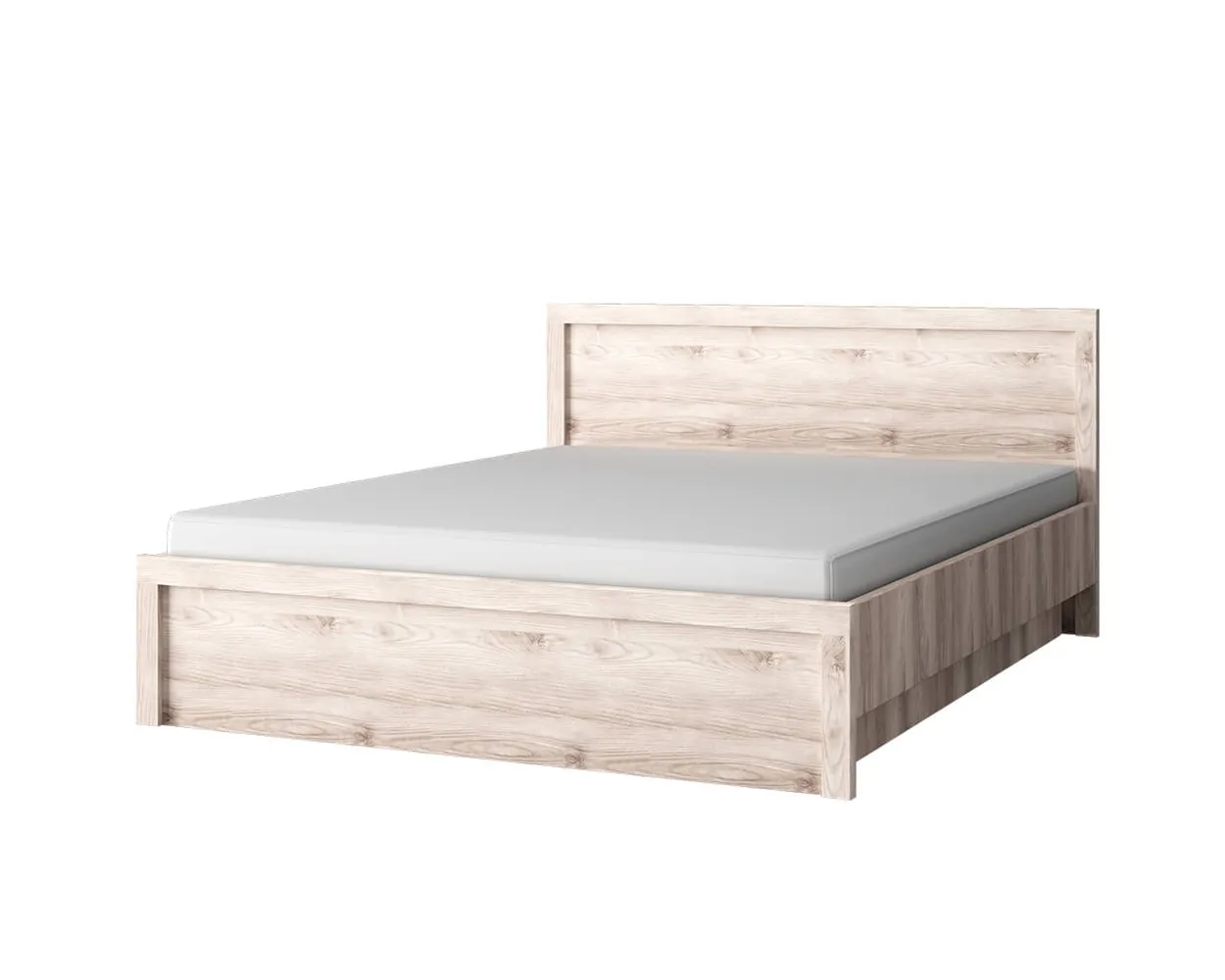 Мебель изготовлена из прочного ЛДСП. Изголовье украшено лаконичной рамкой. Изножье отсутствует, что визуально увеличивает спальное место. Основание кровати из ортопедической решетки с ламелями.