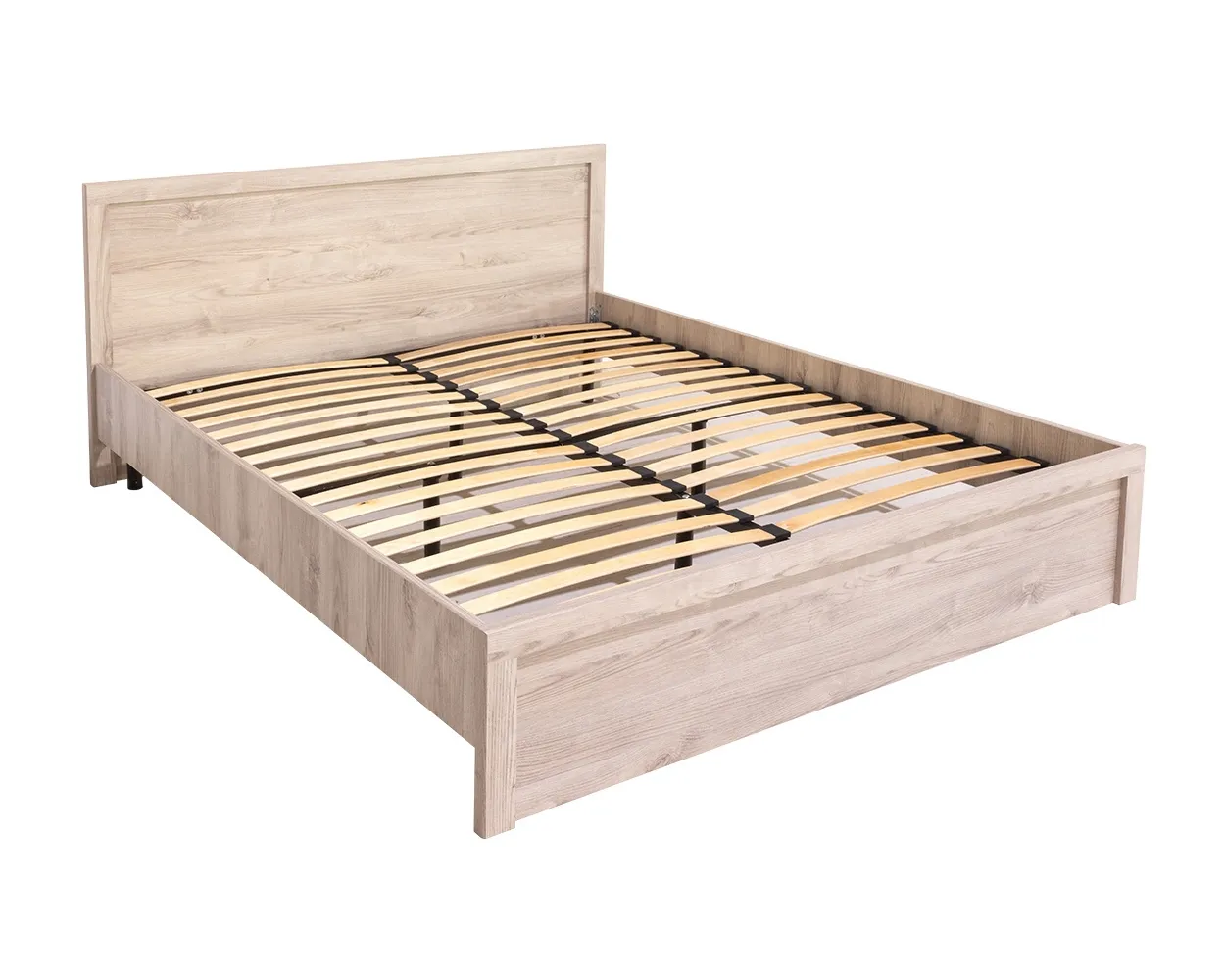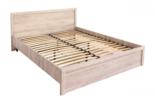 Мебель изготовлена из прочного ЛДСП. Изголовье украшено лаконичной рамкой. Изножье отсутствует, что визуально увеличивает спальное место. Основание кровати из ортопедической решетки с ламелями.
