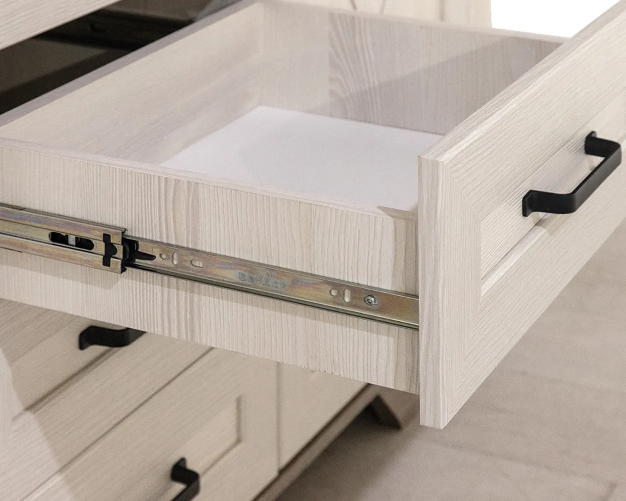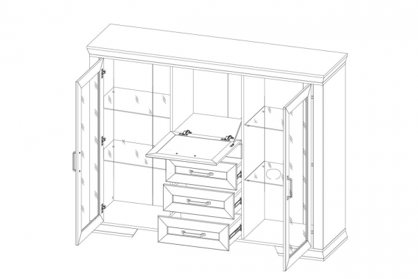 Мебель изготовлена из прочного ЛДПС. Основными украшениями изделия являются шпросы из МДФ, матовое стекло и контрастные металлические ручки. Тумба разделена на 4 отделения: 2 отделения со стеклянными полками за распашными дверями со стеклянной вставкой, отделение в центральной части за откидной дверью, 3 выдвижных ящика на роликовых направляющих.