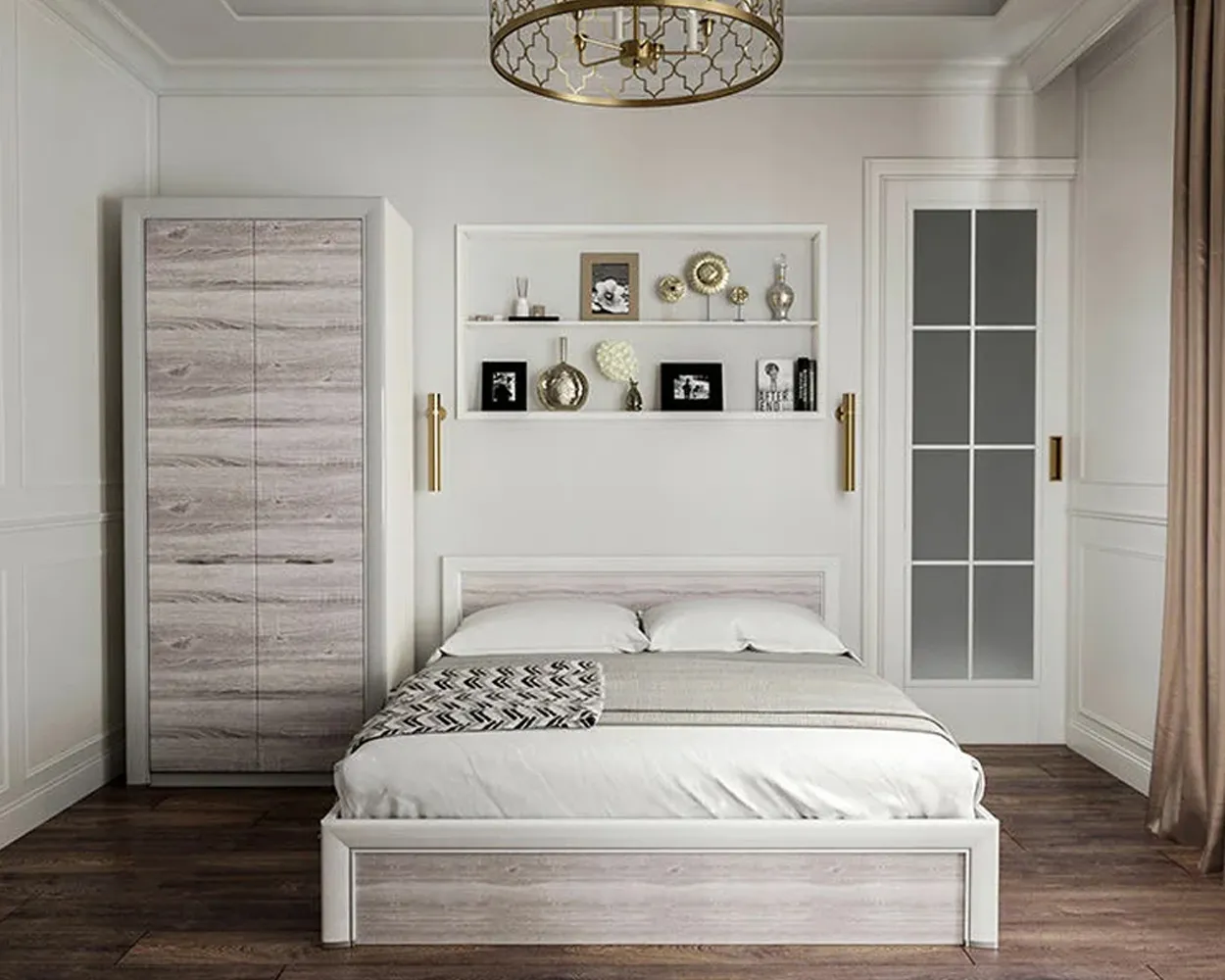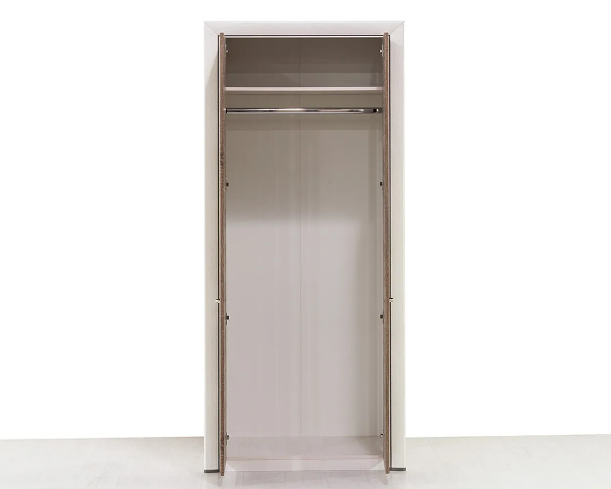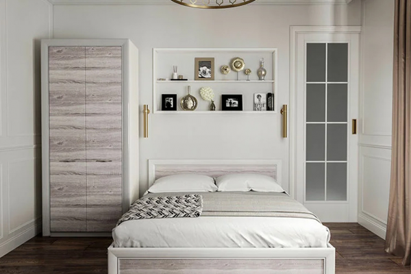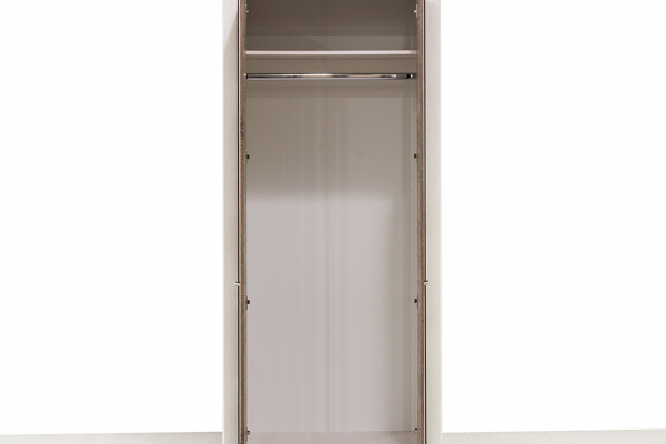 Изделие изготовлено из прочного ЛДСП. Его фасад украшен лаконичной рамой из МДФ с патиной. Удобства в использовании добавляют изящные металлические ручки и качественная фурнитура. Внутри шкаф укомплектован стационарной полкой и большой продольной штангой, позволяющей хранить одежду на вешалках.