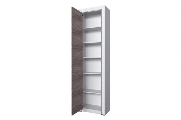 Изделие изготовлено из прочного ЛДСП. Его фасад украшен лаконичной рамой из МДФ с патиной. Удобства в использовании добавляют изящная металлическая ручка и качественная фурнитура. Внутри пенал укомплектован пятью полками, четыре являются съемными, что дает вам полный контроль над организацией полезного пространства.