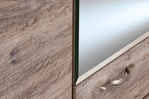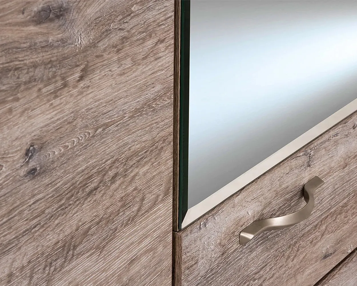 Изделие изготовлено из прочного ЛДСП. Его фасад украшен лаконичной рамой из МДФ с патиной, а также большим зеркалом с фацетом. Удобства в использовании добавляют изящные металлические ручки и качественная фурнитура. Внутри шкаф оборудован достаточно большой продольной штангой для размещения одежды на вешалках, двумя выдвижными ящиками для хранения белья и аксессуаров, а также шестью полками, четыре являются съемными.