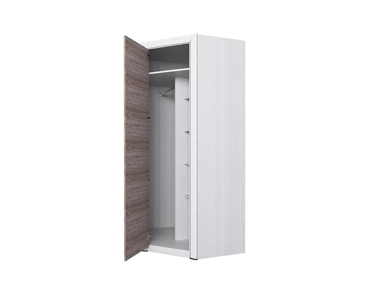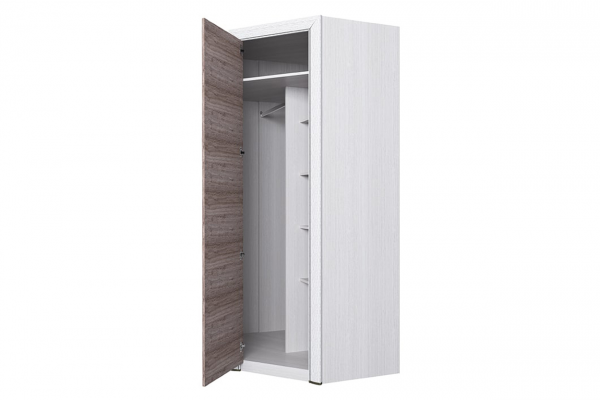 Изделие изготовлено из прочного ЛДСП. Его фасад украшен лаконичной рамой из МДФ с патиной. Удобства в использовании добавляют изящная металлическая ручка и качественная фурнитура. Внутри шкаф оснащен большой продольной штангой, одной стационарной и четырьмя съемными полками.