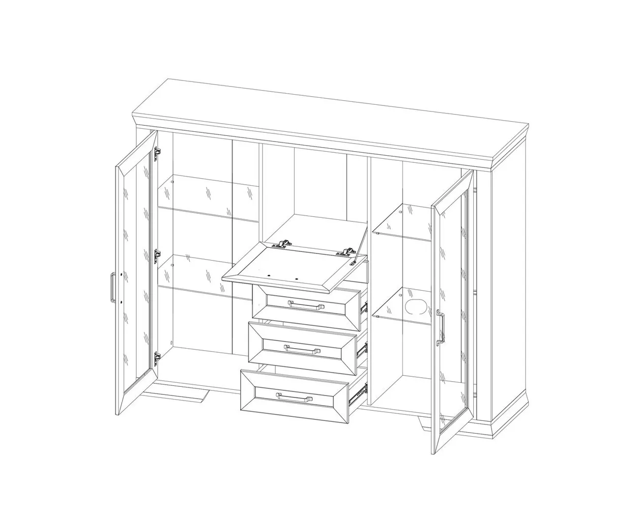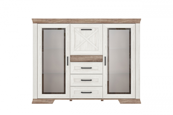 Мебель изготовлена из прочного ЛДПС. Основными украшениями изделия являются шпросы из МДФ, матовое стекло и контрастные металлические ручки. Тумба разделена на 4 отделения: 2 отделения со стеклянными полками за распашными дверями со стеклянной вставкой, отделение в центральной части за откидной дверью, 3 выдвижных ящика на роликовых направляющих.