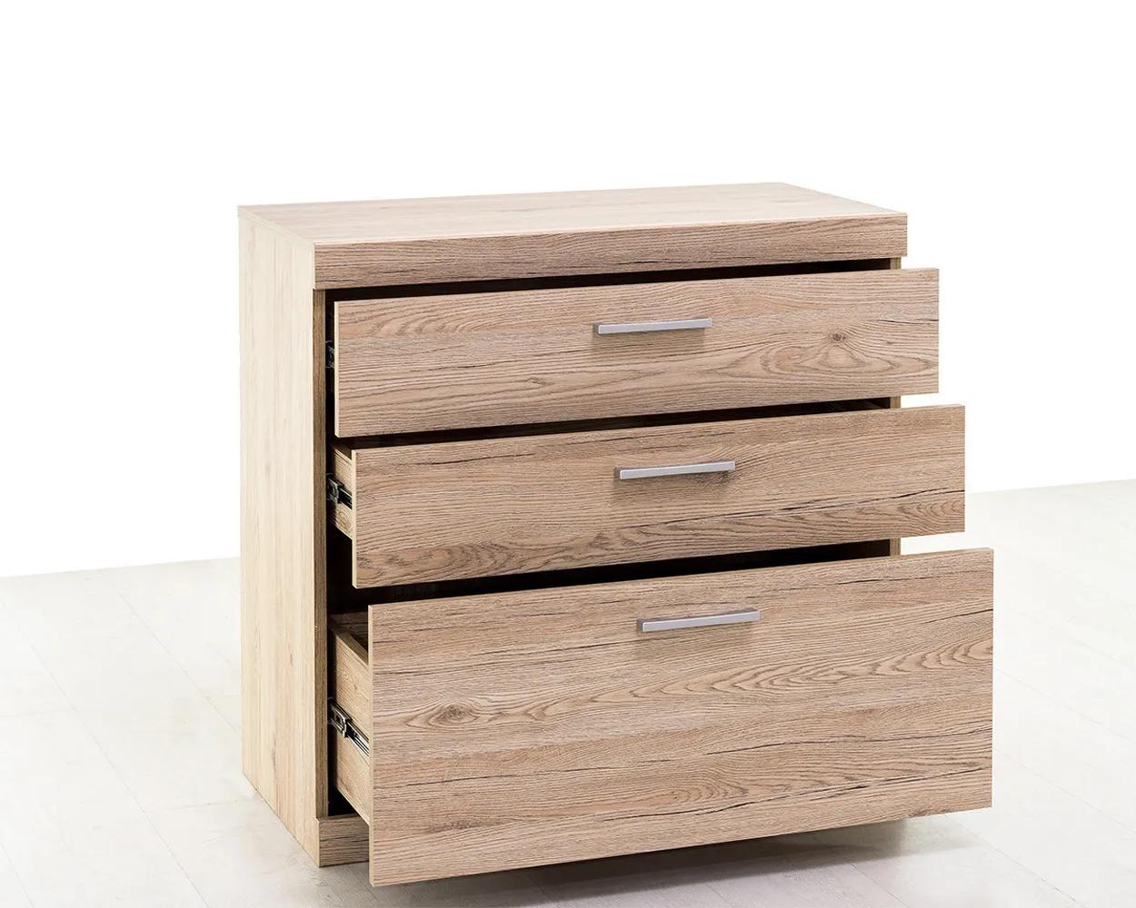 Изделие выполнено из качественного ЛДСП с использованием надежной фурнитуры. Удобства в использовании добавляют лаконичные ручки. Комод укомплектован двумя стандартными ящиками и одним большим.