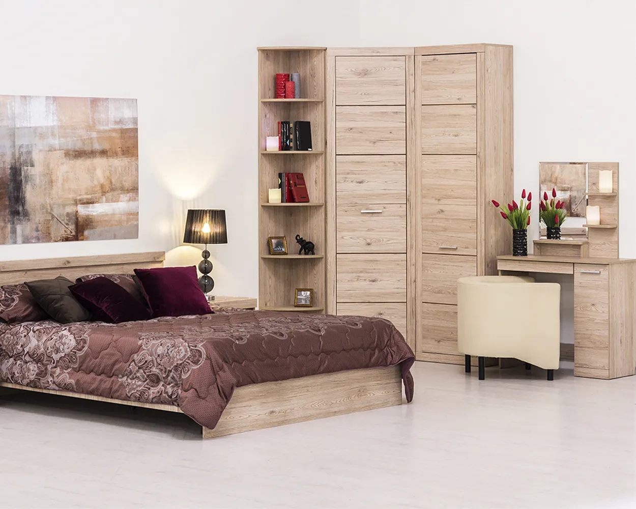 Простой и компактный открытый угловой шкаф легко впишется в современный интерьер гостиной, спальни, детской или кабинета. Теплый тон и оригинальная текстура дерева Дуб Санремо весьма эффектно смотрятся, добавляя комнате света и уюта.