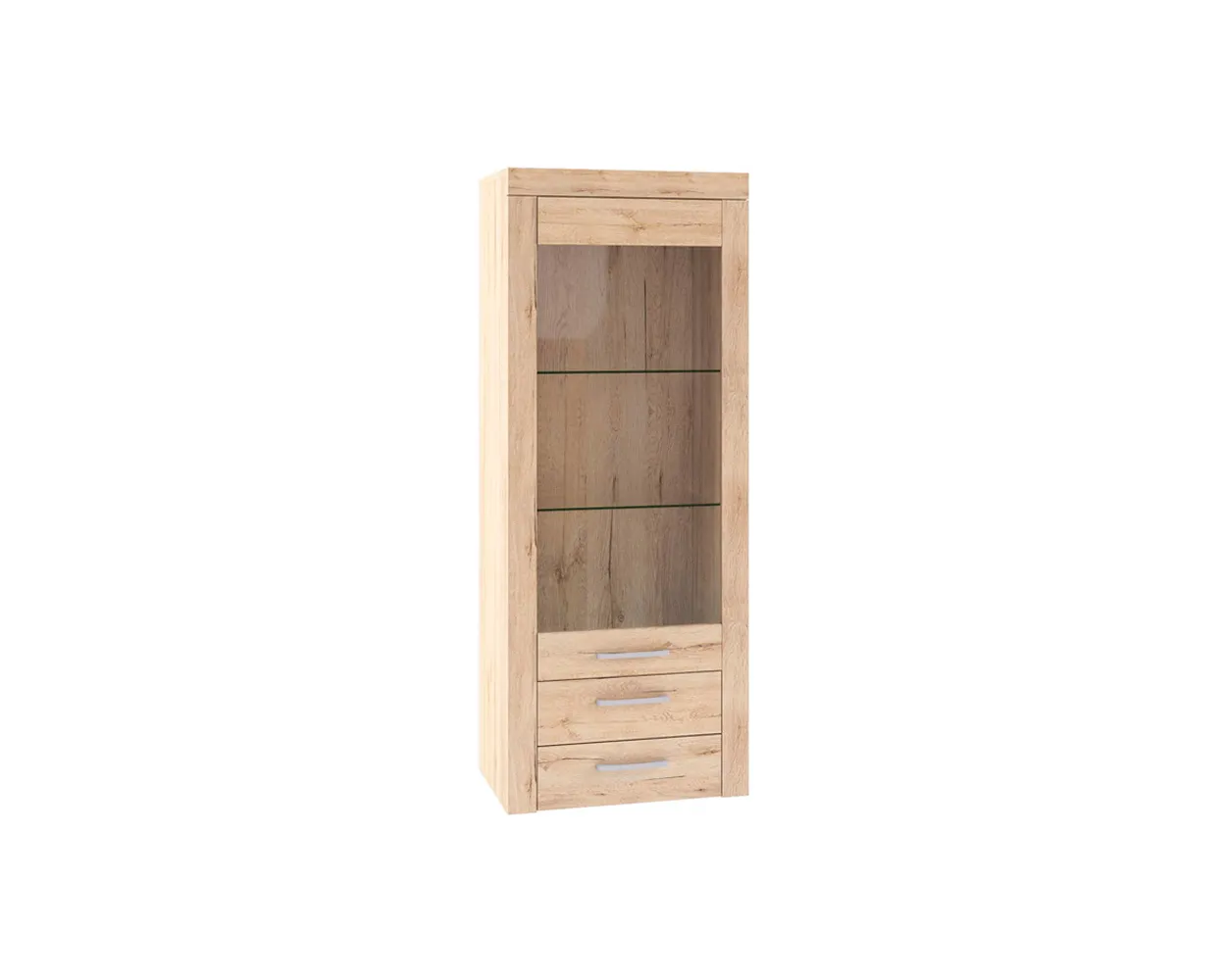 Шкаф Оскар изготовлен из качественного ЛДСП с использованием надежной фурнитуры. Фасад изделия украшен прозрачным стеклом. Удобства в использовании добавляют лаконичные ручки. Витрина укомплектована двумя полками из закаленного стекла, и двумя выдвижными ящиками на роликовых направляющих.