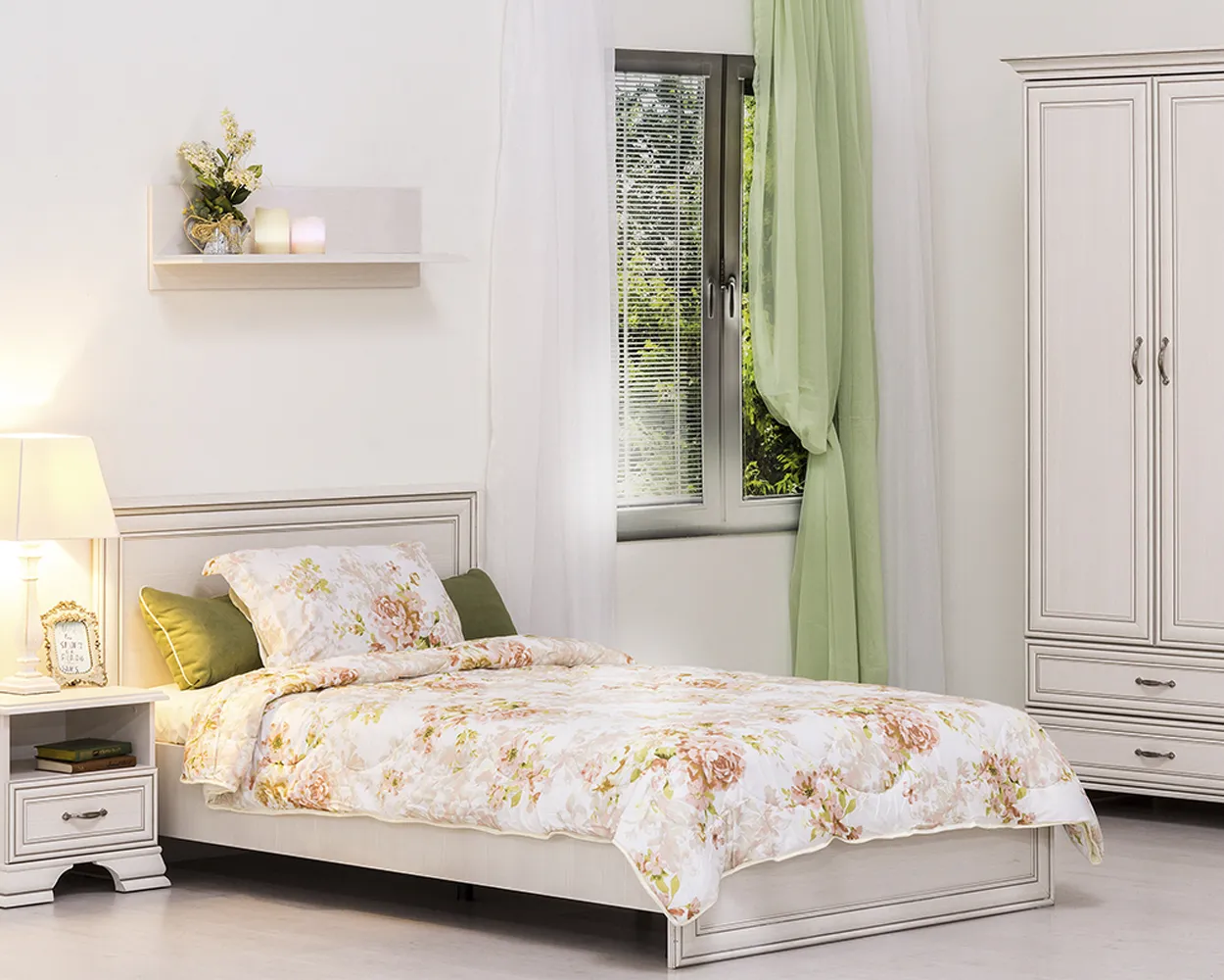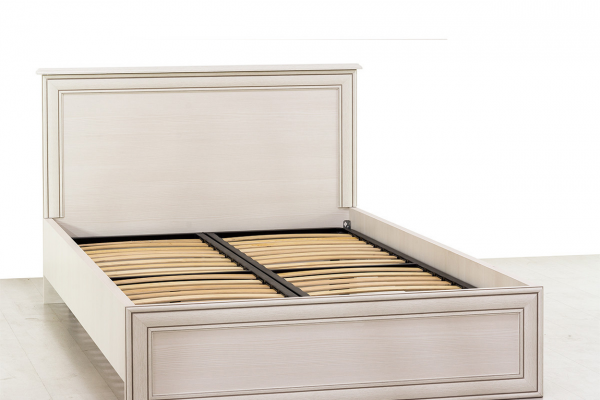 Кровать изготовлена из качественных материалов, изголовье выделяется сдержанным декором в виде планок из МДФ, украшенных патиной. Изножье отсутствует, что визуально увеличивает спальное ложе. Основание кровати из ортопедической решетки с ламелями.