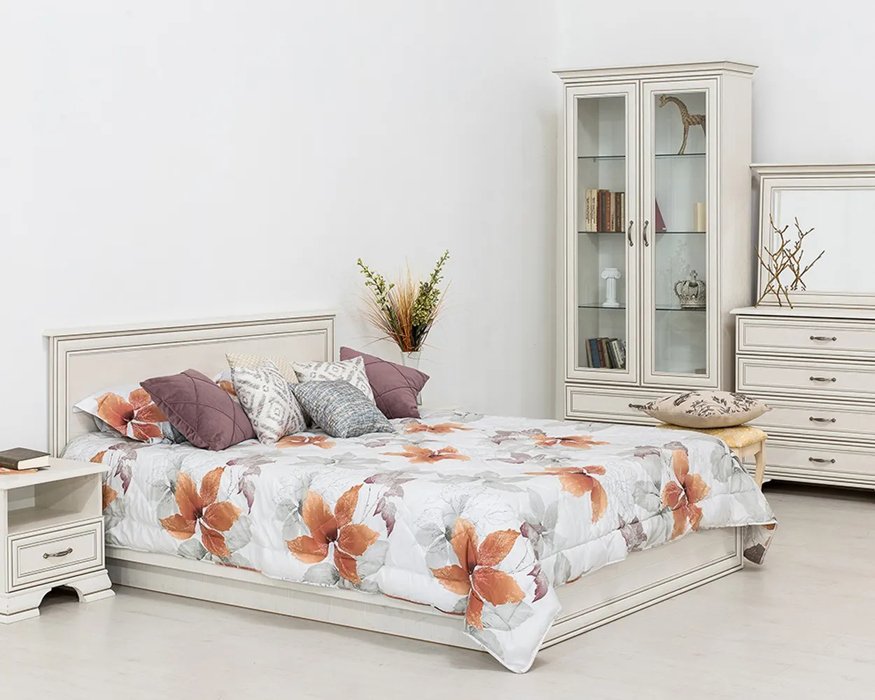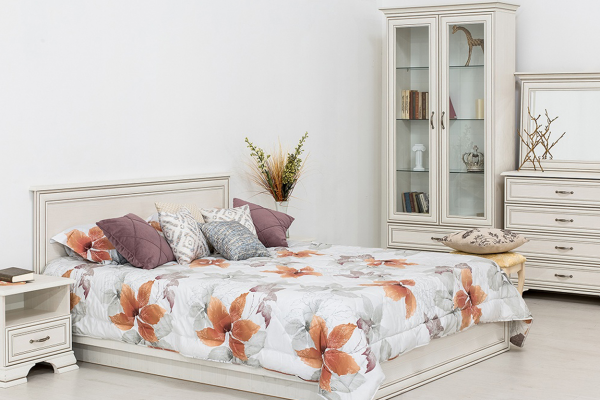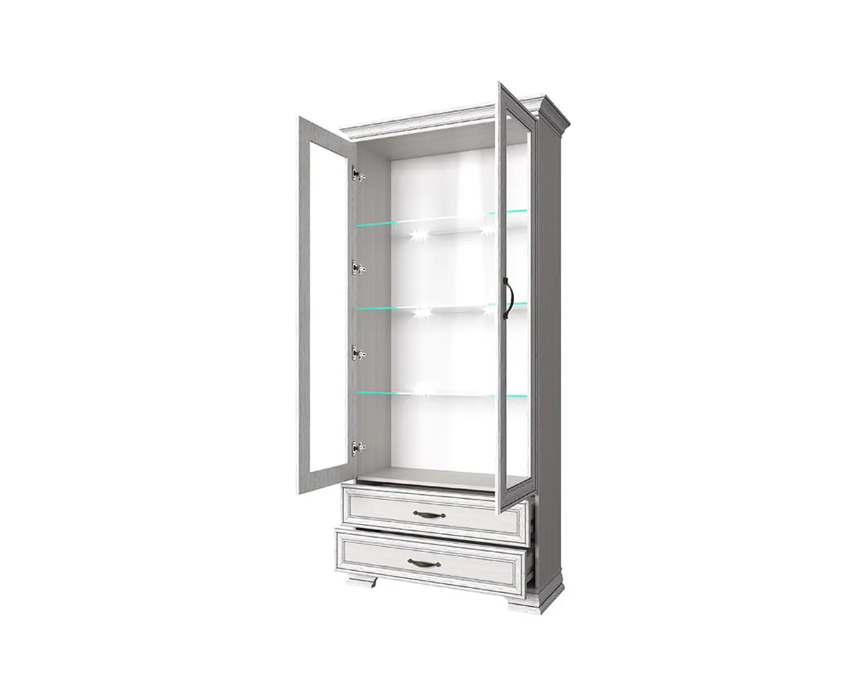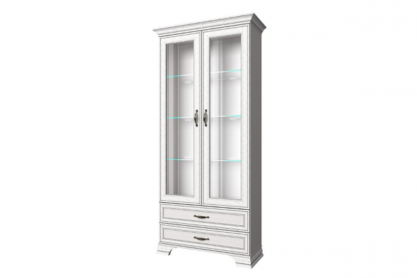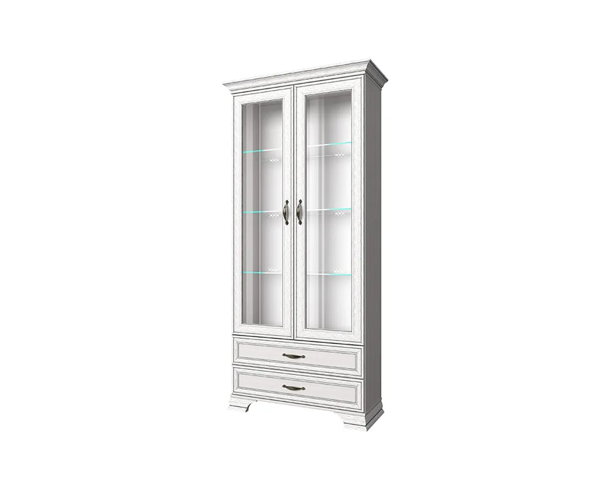 Изделие производится из надежных материалов. Фасады украшены лаконичными планками из МДФ с изысканной патиной и прозрачным стеклом. Верх дополнен стильным карнизом, а низ фигурными ножками. Удобство во время использования обеспечивают оригинальные металлические ручки. Шкаф-витрина укомплектована тремя полочками из закаленного стекла и двумя выдвижными ящиками.