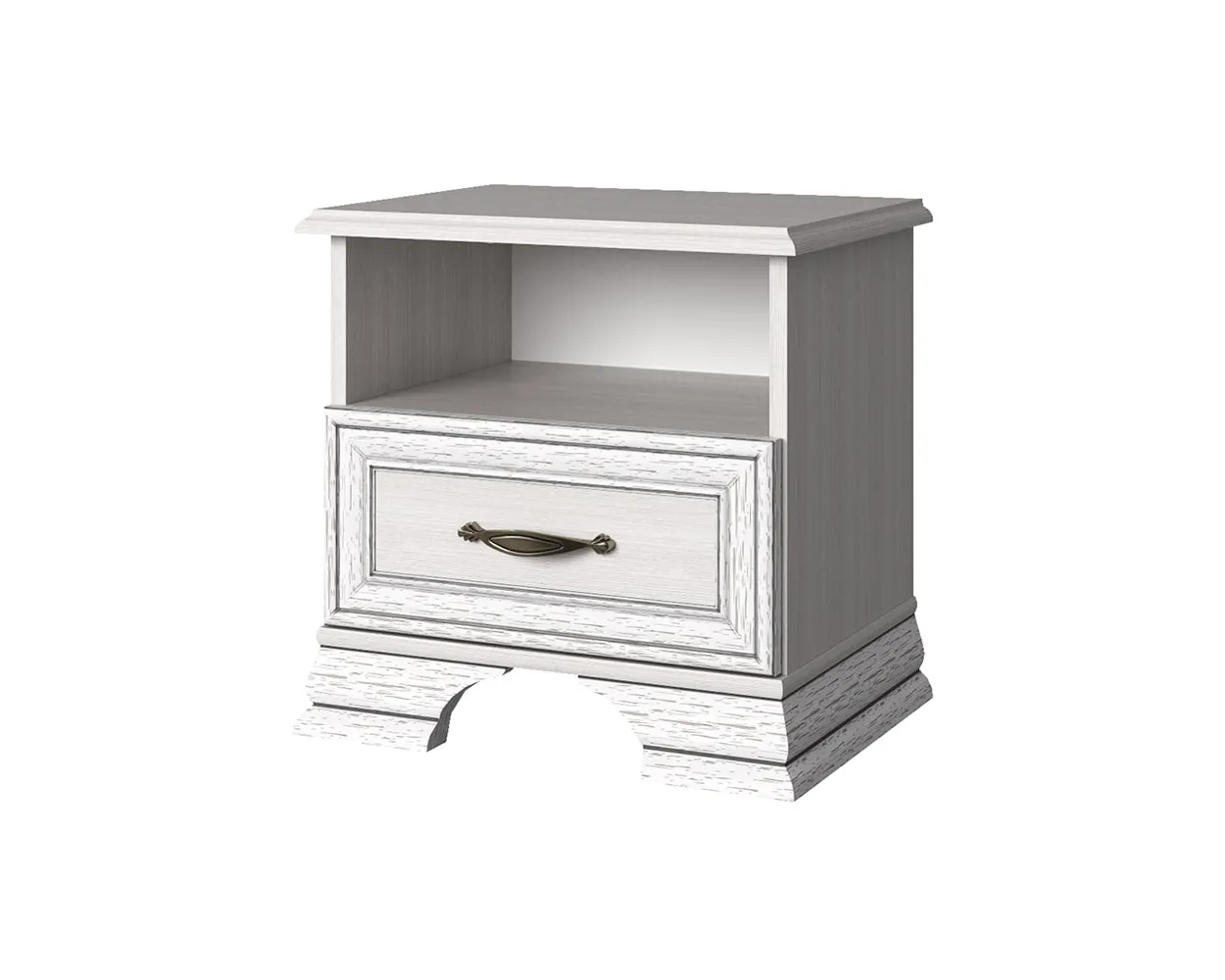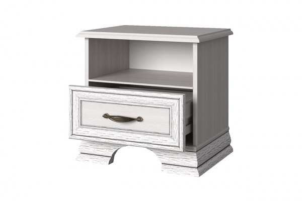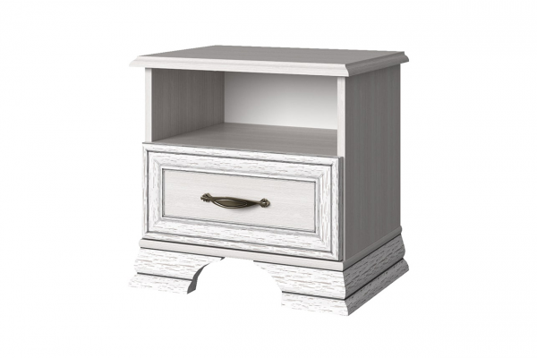 Изделие производится из надежных материалов. Фасады украшены лаконичными планками из МДФ с изысканной патиной. Низ дополнен фигурными ножками. Удобство во время использования обеспечивают оригинальные металлические ручки. Изделие укомплектовано одним выдвижным ящичком, на роликовых направляющих и вместительной, открытой нишей.