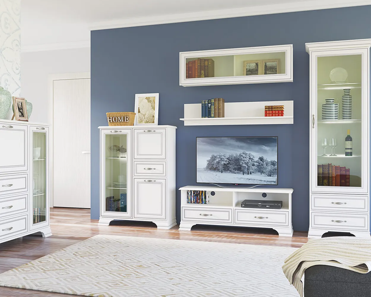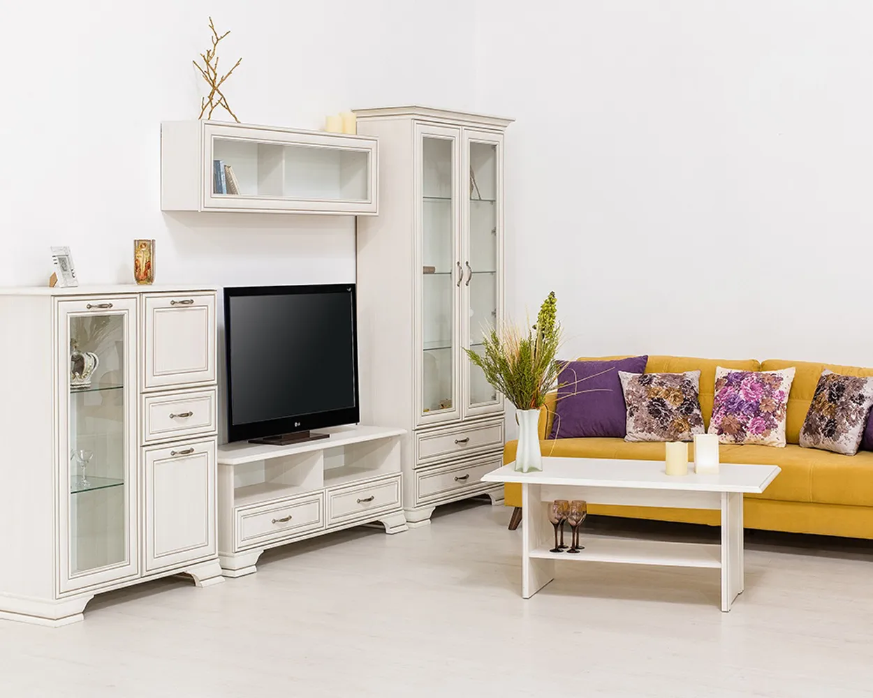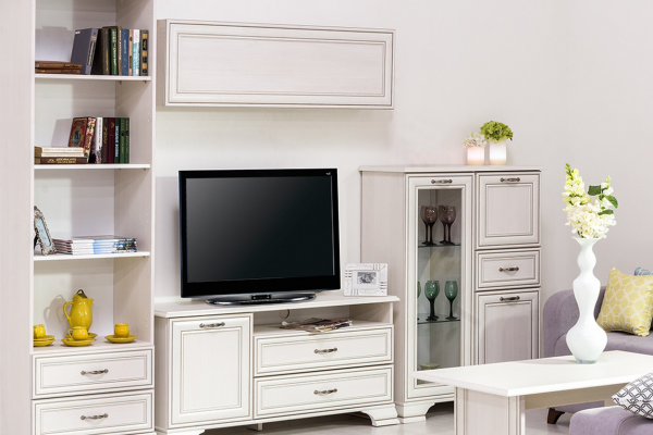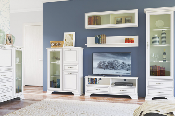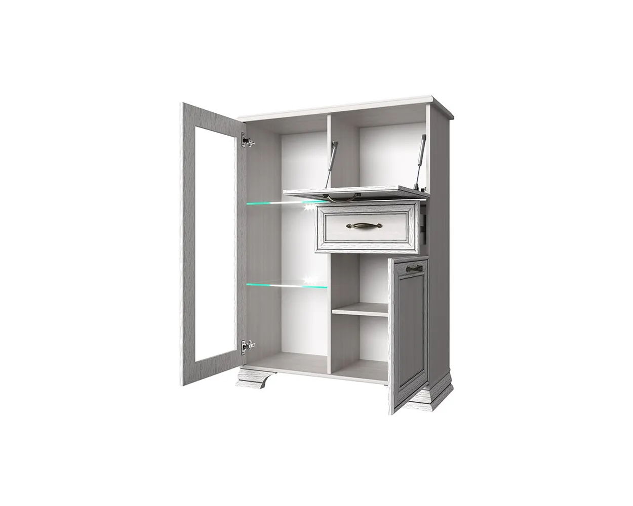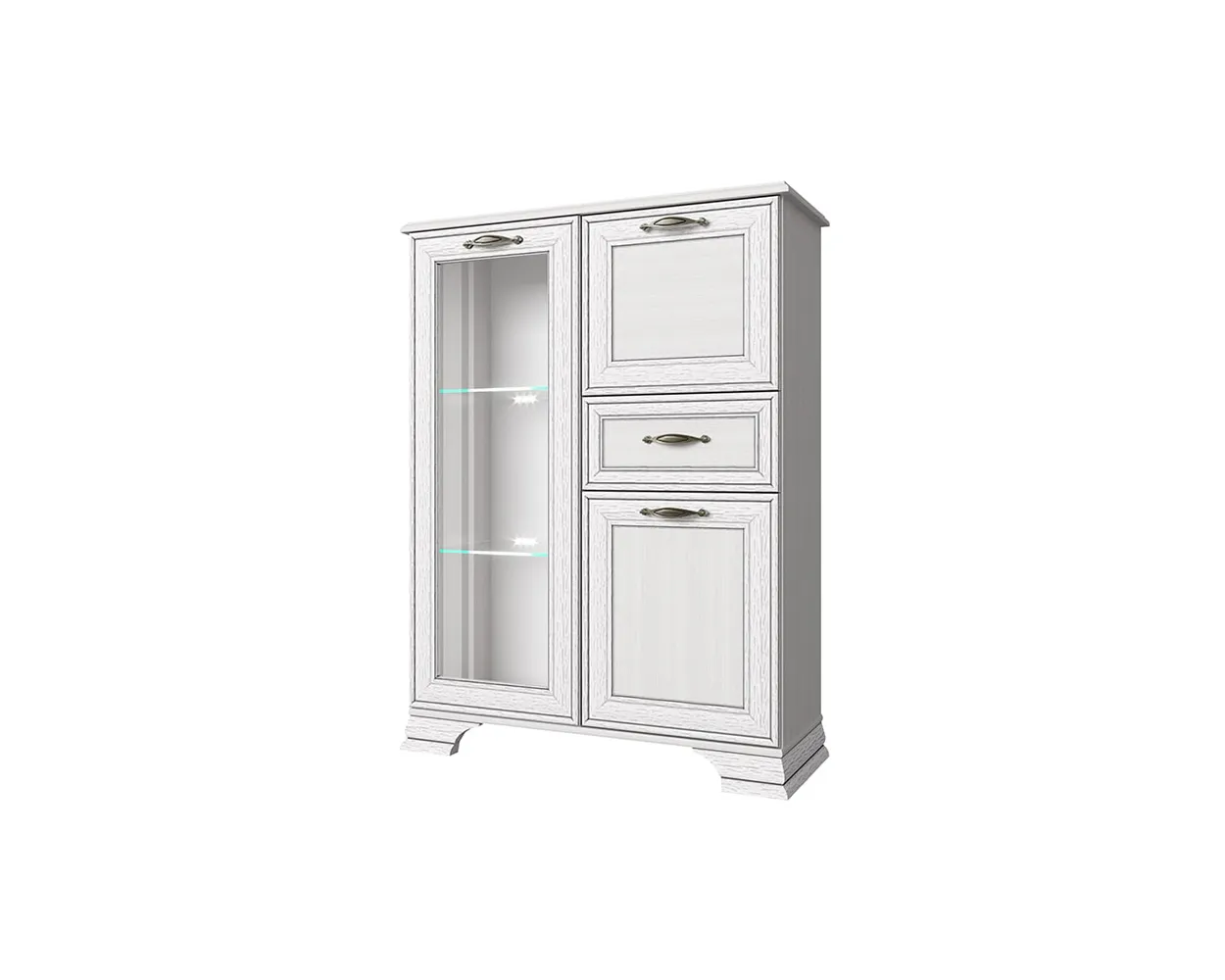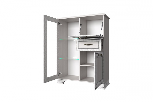 Изделие производится из надежных материалов. Фасады украшены лаконичными планками из МДФ с изысканной патиной и прозрачным стеклом. Низ дополнен фигурными ножками. Удобство во время использования обеспечивают оригинальные металлические ручки. В правой части имеется две полки за откидной и распашной дверцами, и один выдвижной ящик.